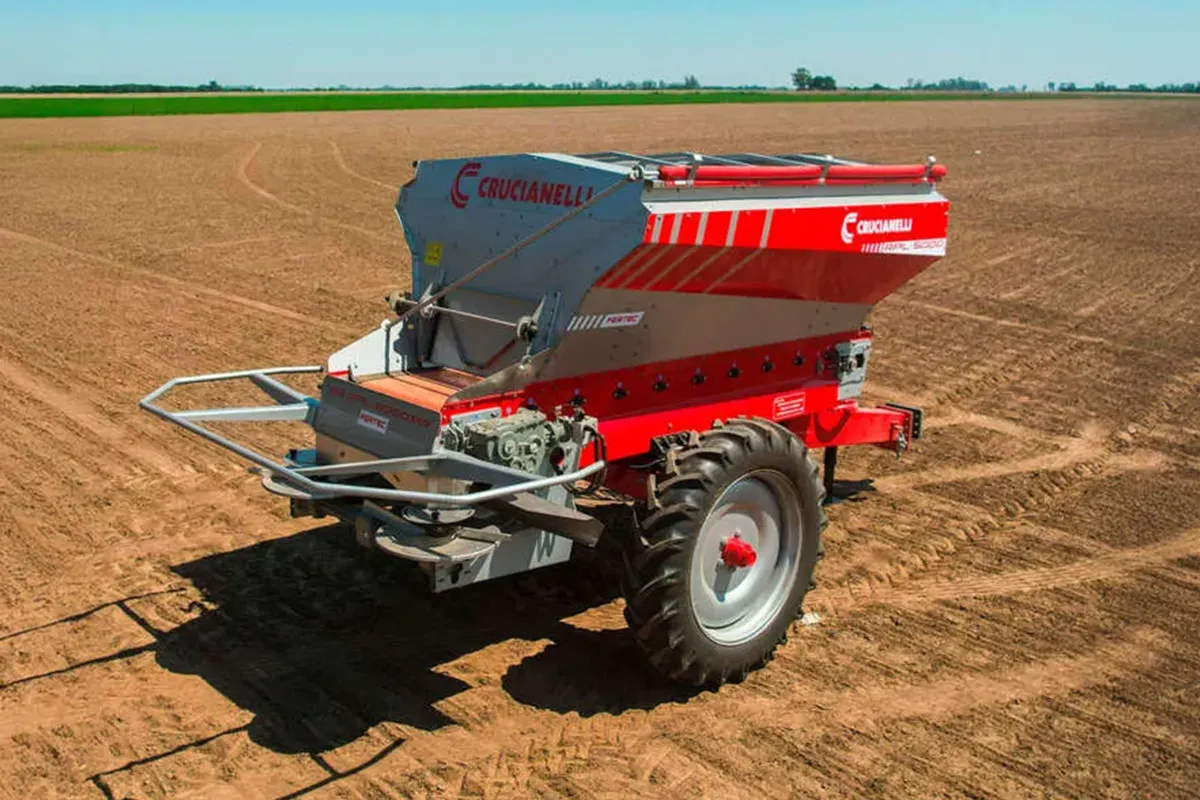 La fertilizadora de arrastre Crucianelli Fertec es la única en el mercado con cinta de 1 metro de ancho en PVC, diseñada para brindar máxima adaptabilidad y un rango de dosis superior en la aplicación de fertilizantes y materiales heterogéneos, asegurando precisión y eficiencia en cada trabajo.